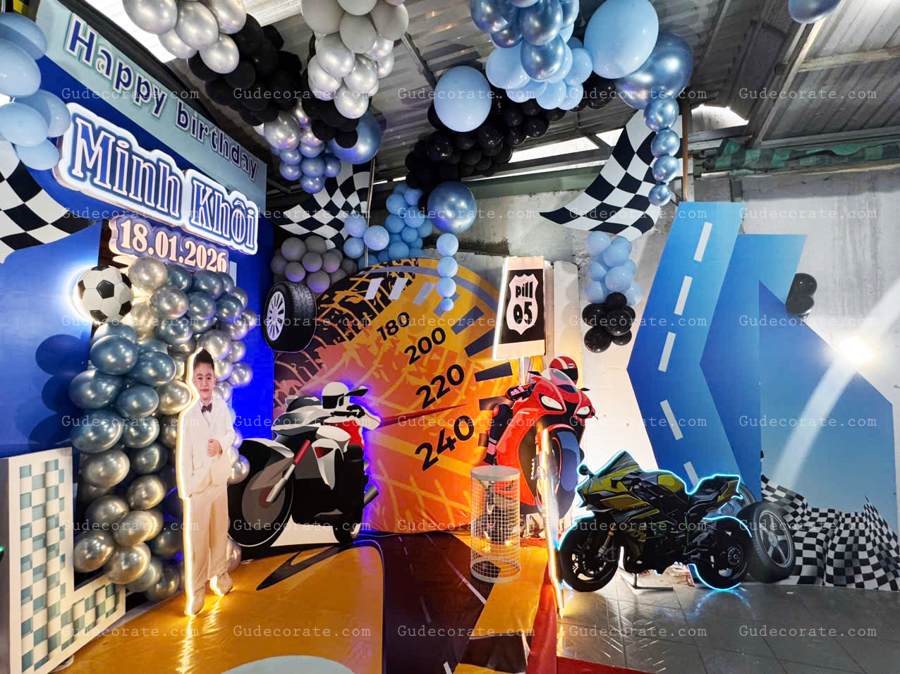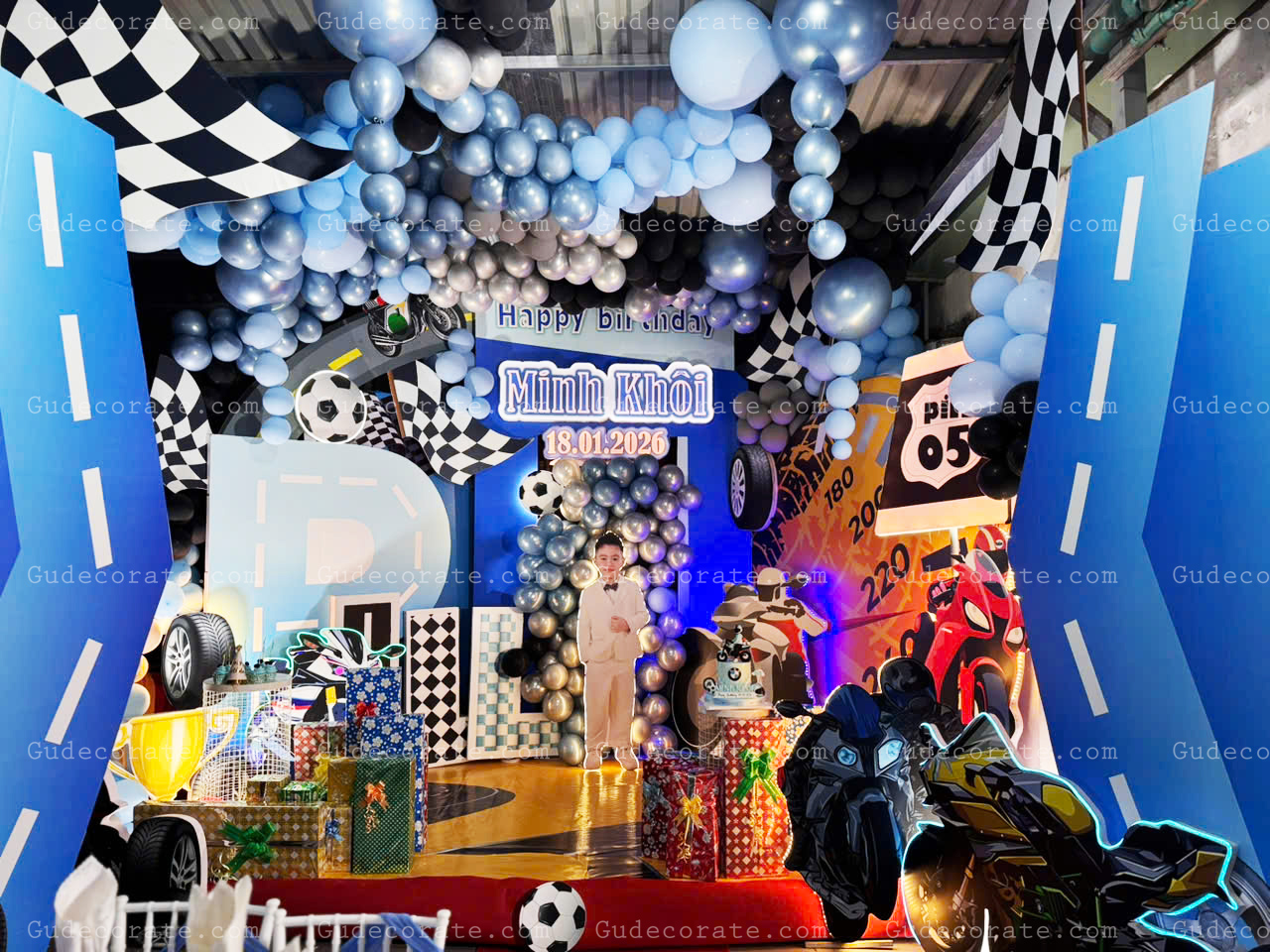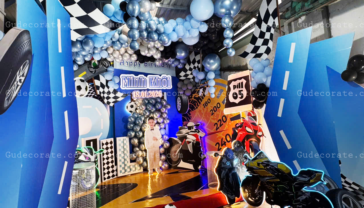 Trang trí sinh nhật theo chủ đề đang trở thành xu hướng được nhiều phụ huynh lựa chọn để tạo nên những kỷ niệm đáng nhớ cho con. Trong đó, concept đua xe – motor thể thao nổi bật với phong cách mạnh mẽ, cá tính, cực kỳ phù hợp cho các bé trai năng động.
