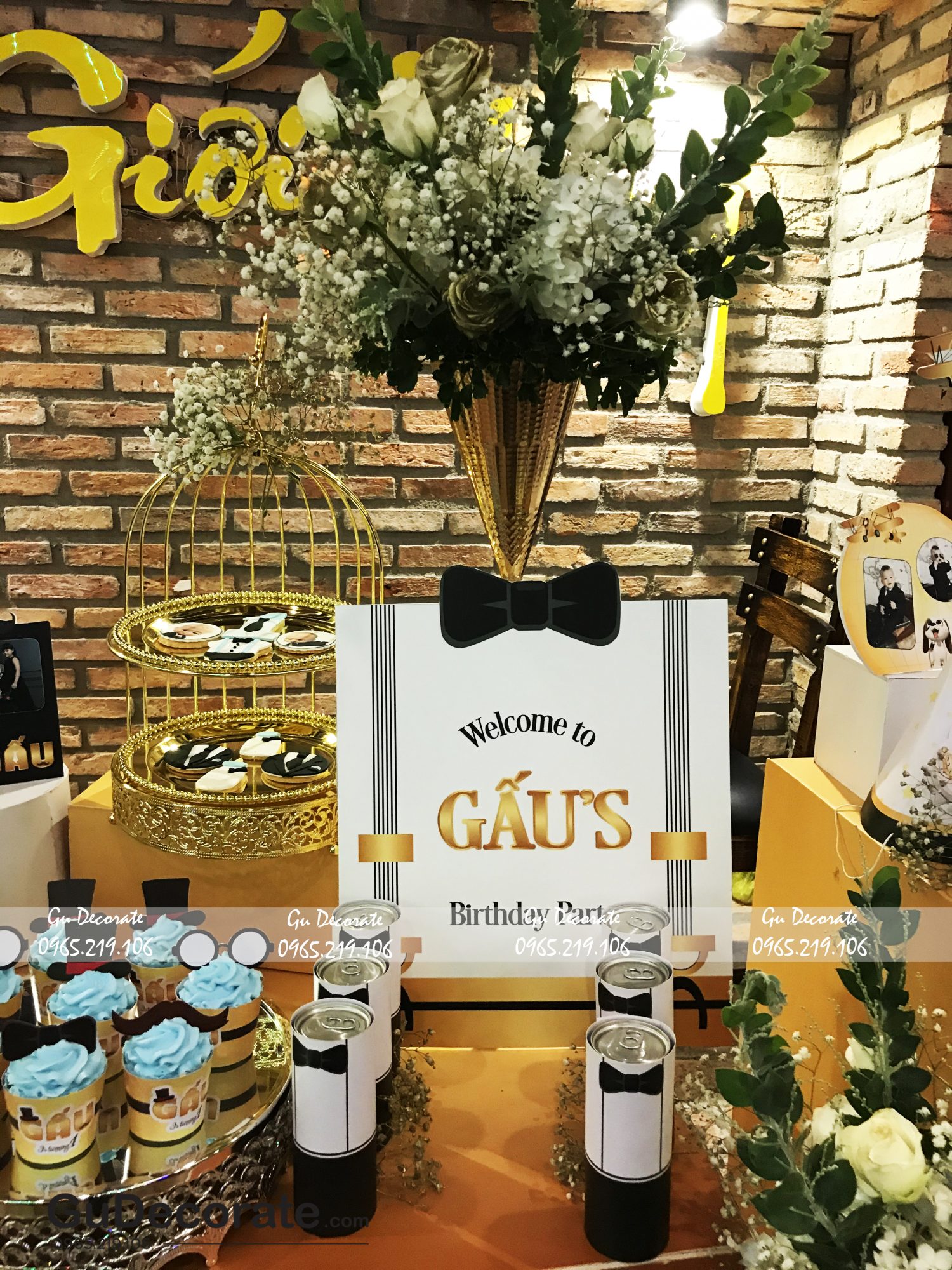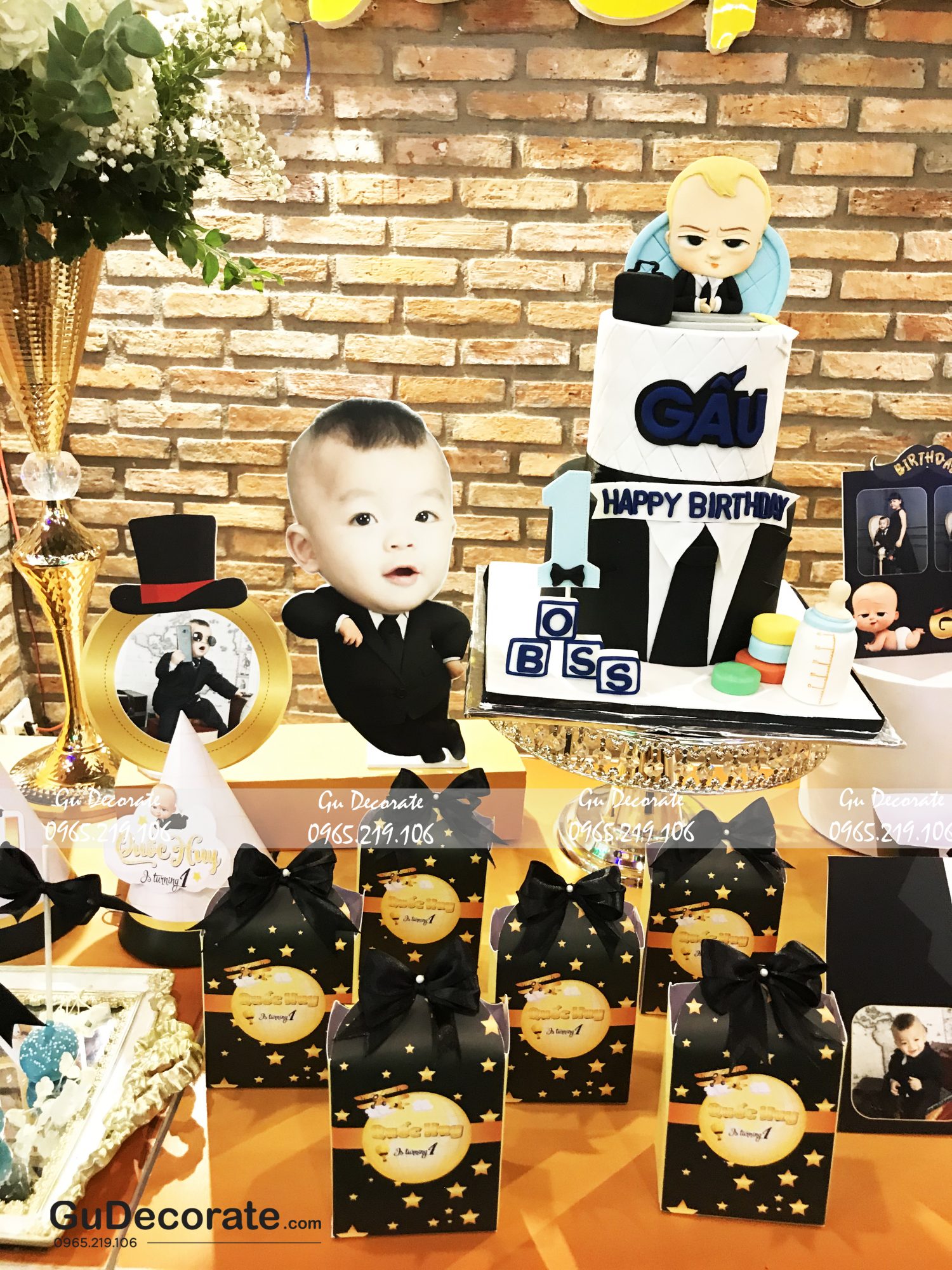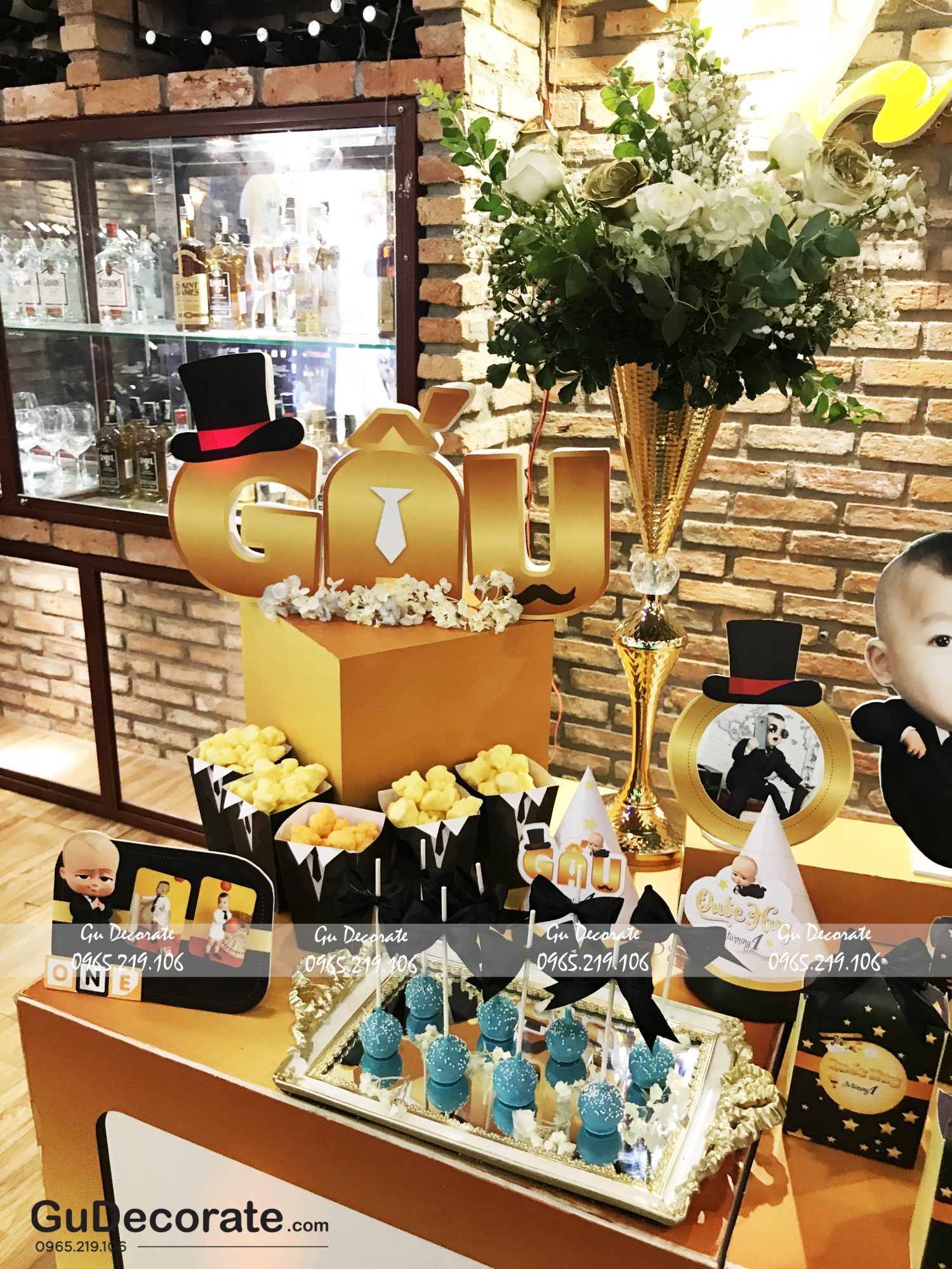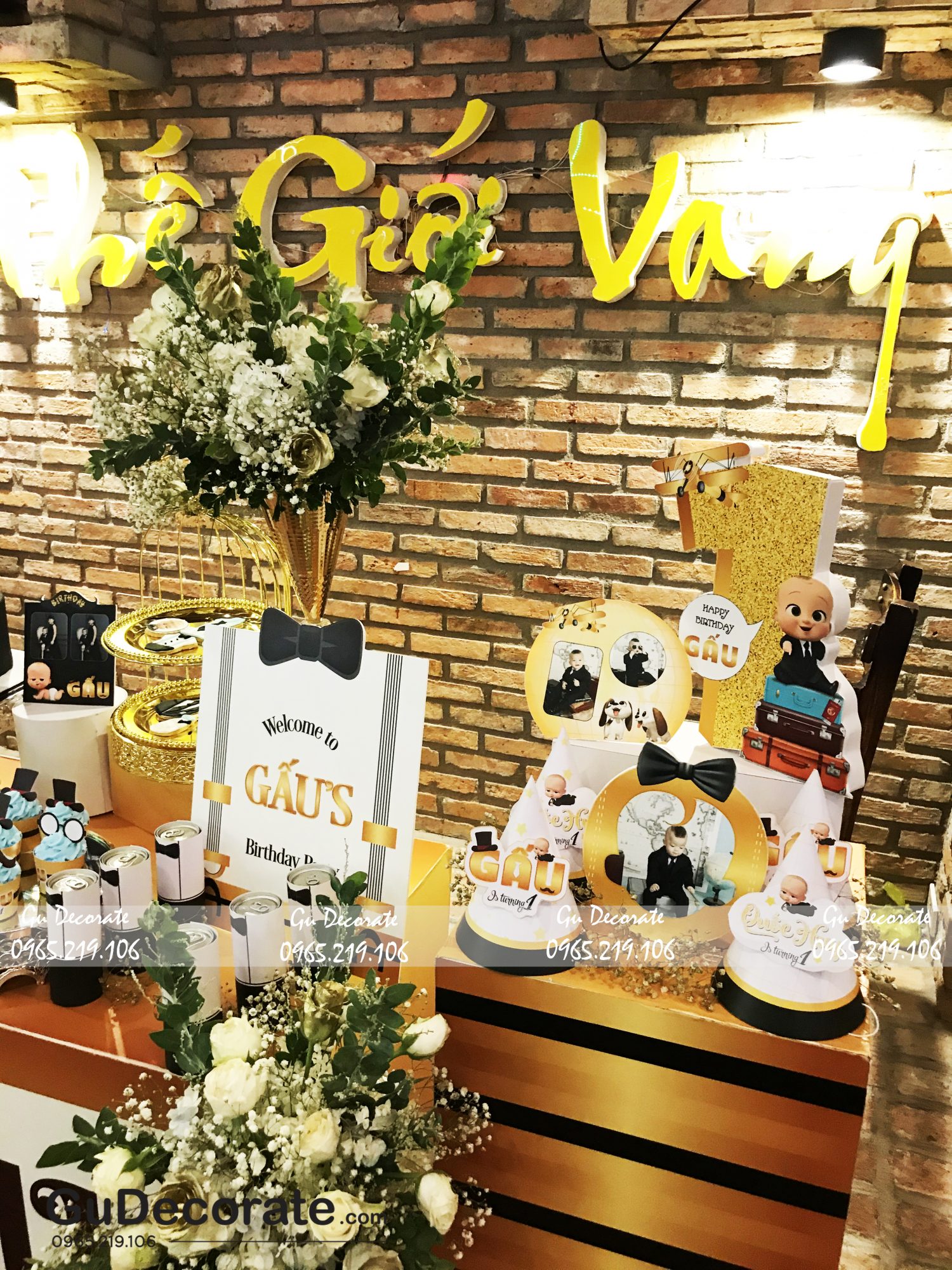 Lấy cảm hứng từ bộ phim hoạt hình nổi tiếng “Baby Boss”, Gu trang trí buổi tiệc sinh nhật cho bé Gấu vừa tinh nghịch, vừa đáng yêu. Lấy tone vàng gold và đen làm chủ đạo, thêm hoa tươi là điểm nhấn của không gian bữa tiệc.