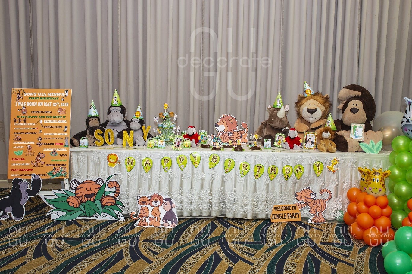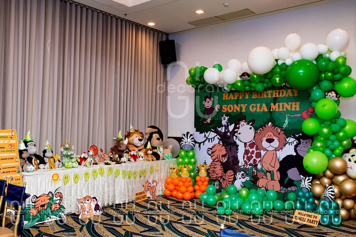 Bé “Sony” Gia Minh cũng đã tổ chức một buổi tiệc chủ đề rừng vừa qua. Với tone màu chủ đạo xanh lá, kết hợp cùng nhiều màu tương phản khác đã tạo nên một background vô cùng bắt mắt. Chỉ là mẫu phông nền đơn giản nhưng trang trí thêm viền phông bằng đường line bong bóng xoắn to nhỏ nghệ thuật ” màu xanh tượng trưng cho lá cây” “màu trắng là mây”. Thật thú vị đúng không nào?. “Trang trí sinh nhật cho bé Sony phải thật đẹp, thật ấn tượng” mẹ nói