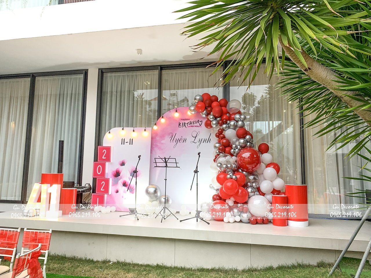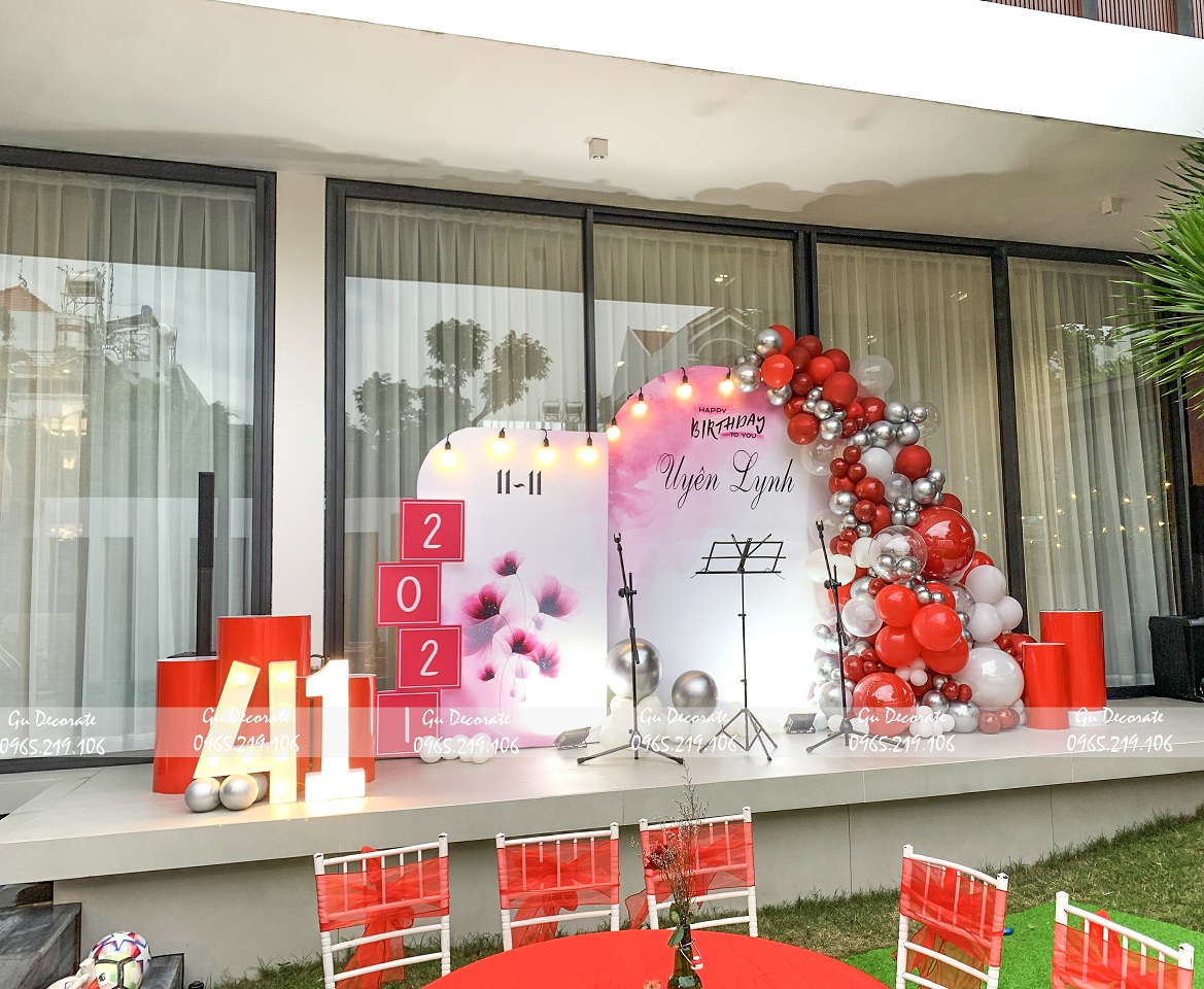 Tại buổi tiệc sinh nhật lần thư 41 của chị Uyên Lynh, phông trang trí sinh nhật sử dụng tone đỏ chủ đạo phối với trắng, sliver. Chất liệu và kiểu phông trang trí sinh nhật ngoài trời là chất liệu fomex cắt bế viền được chúng tôi setup như hình dưới đây