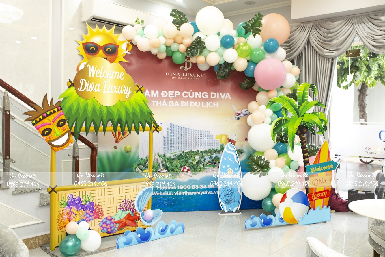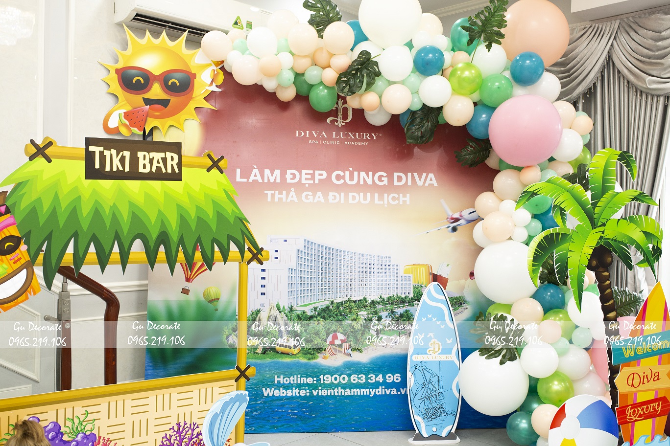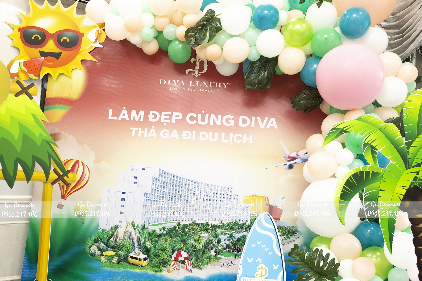 Sự kiện ra mắt ưu đãi của thương hiệu làm đẹp nổi tiếng Diva Luxury. Nhằm mang đến những ưu đãi bất ngờ là một chuyến du lịch khi sử dụng dịch vụ tại Diva. Ngoài ra Diva còn dành tặng cho khách hàng những tấm ảnh lưu niệm bên backdround thật tuyệt đẹp. Trang trí backdround theo chủ đề mùa hè