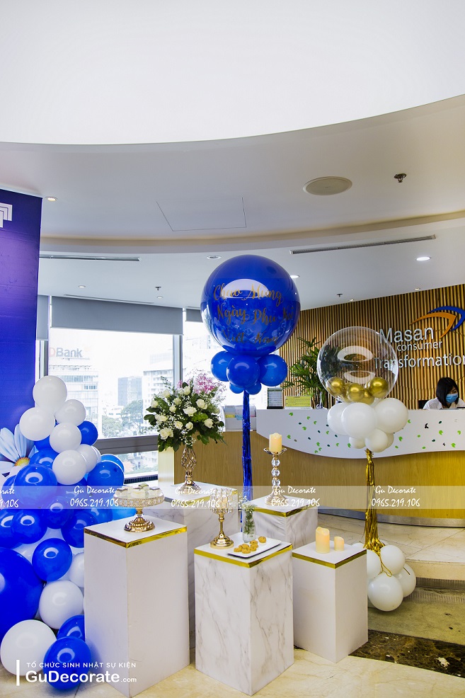 Màu Chủ Đạo Xanh Trắng được lựa chọn cho ngày 20/11 nhưng không hề cá tính mà vẫn rất nhẹ nhàng. Sự kết hợp với bong bóng viền tròn tạo sự mềm mại cho sân khấu. Hiệu ứng bong bóng ánh đồng mà Gu lựa chọn tăng thêm phần sang trọng cho sự kiện này. Bên cạnh đó, hoa tươi và phông chữ cách điệu toát lên vẻ sang trọng cho buổi tiệc của chị em.