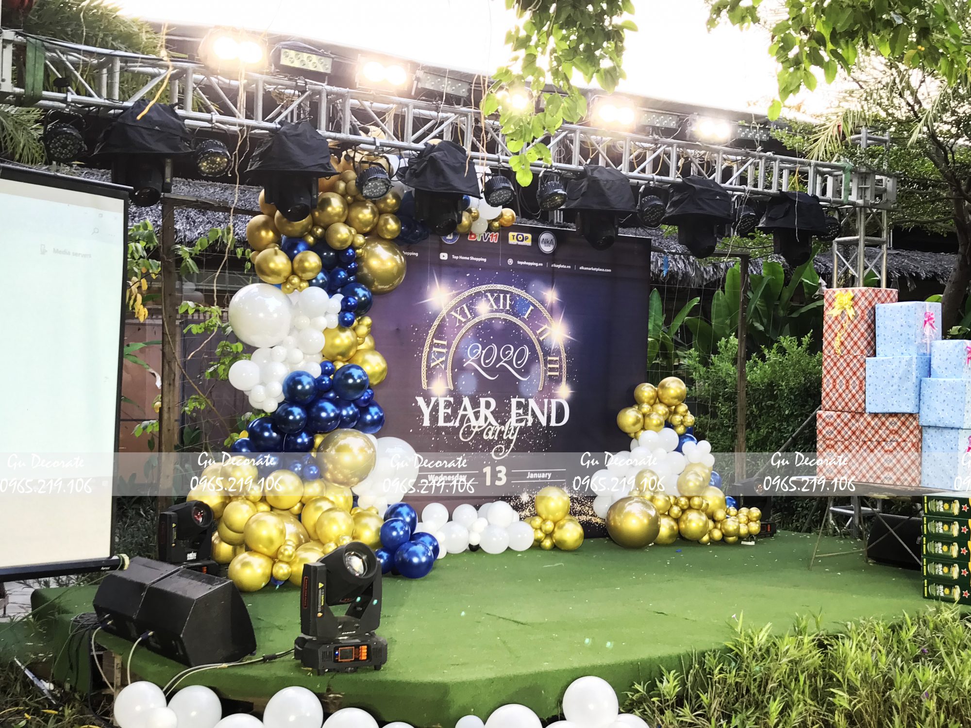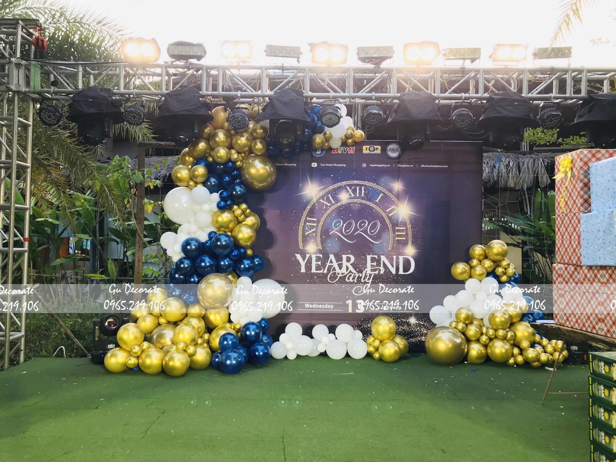 Đối với mẫu trang trí này, Gu chọn tone màu xanh đen cho background. Bên cạnh đó, background in hình chiếc đồng hồ la mã cùng với năm 2020. Về phần trang trí bóng bay, Gu chọn ba màu là vàng gold, xanh đen và tắng tạo nét thêm phần sang trọng cho bữa tiệc. Miếng thảm lót sân khấu thì Gu chọn thảm cỏ xanh lá, giúp không gian trở nên tươi mát hơn.