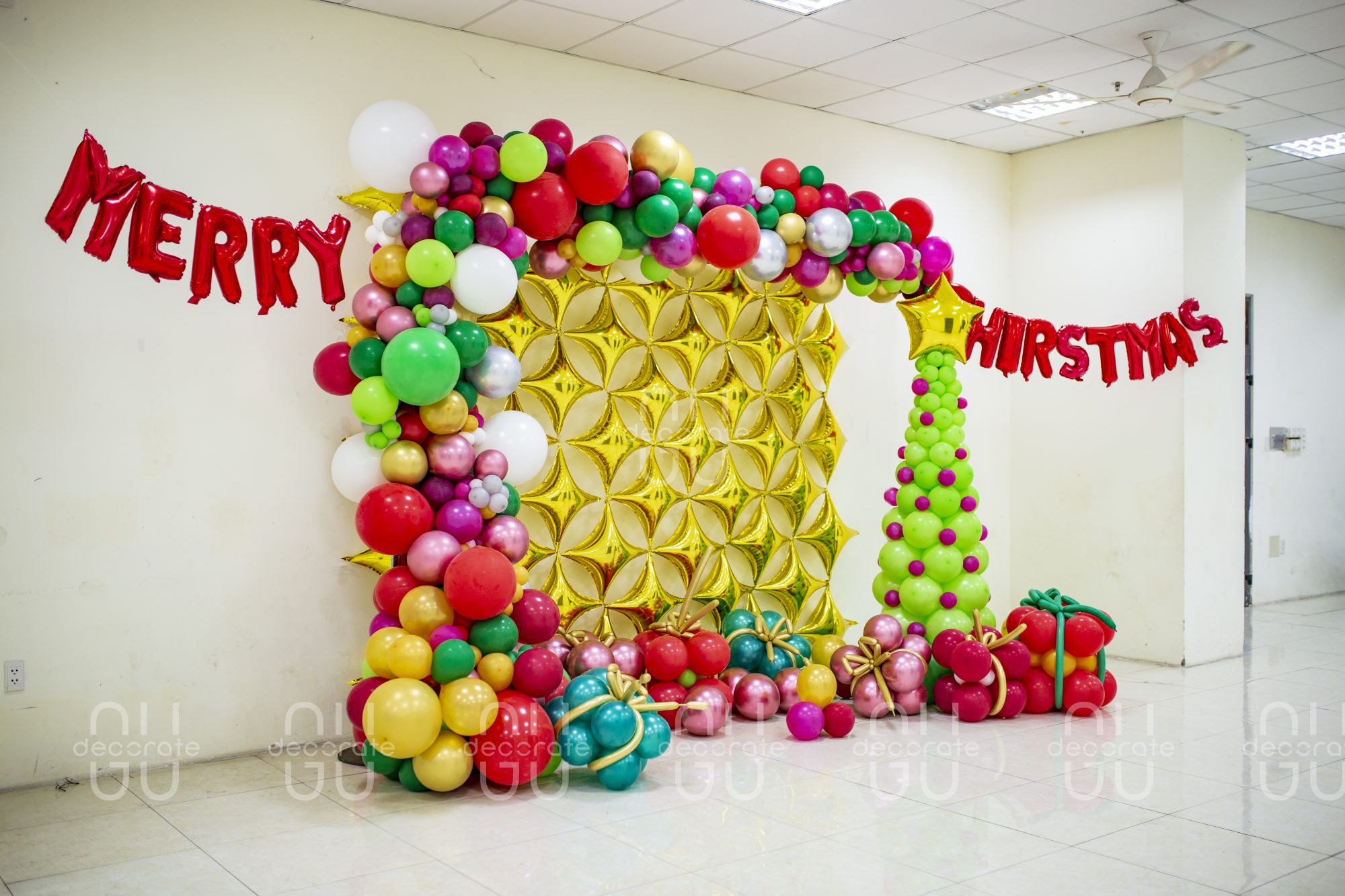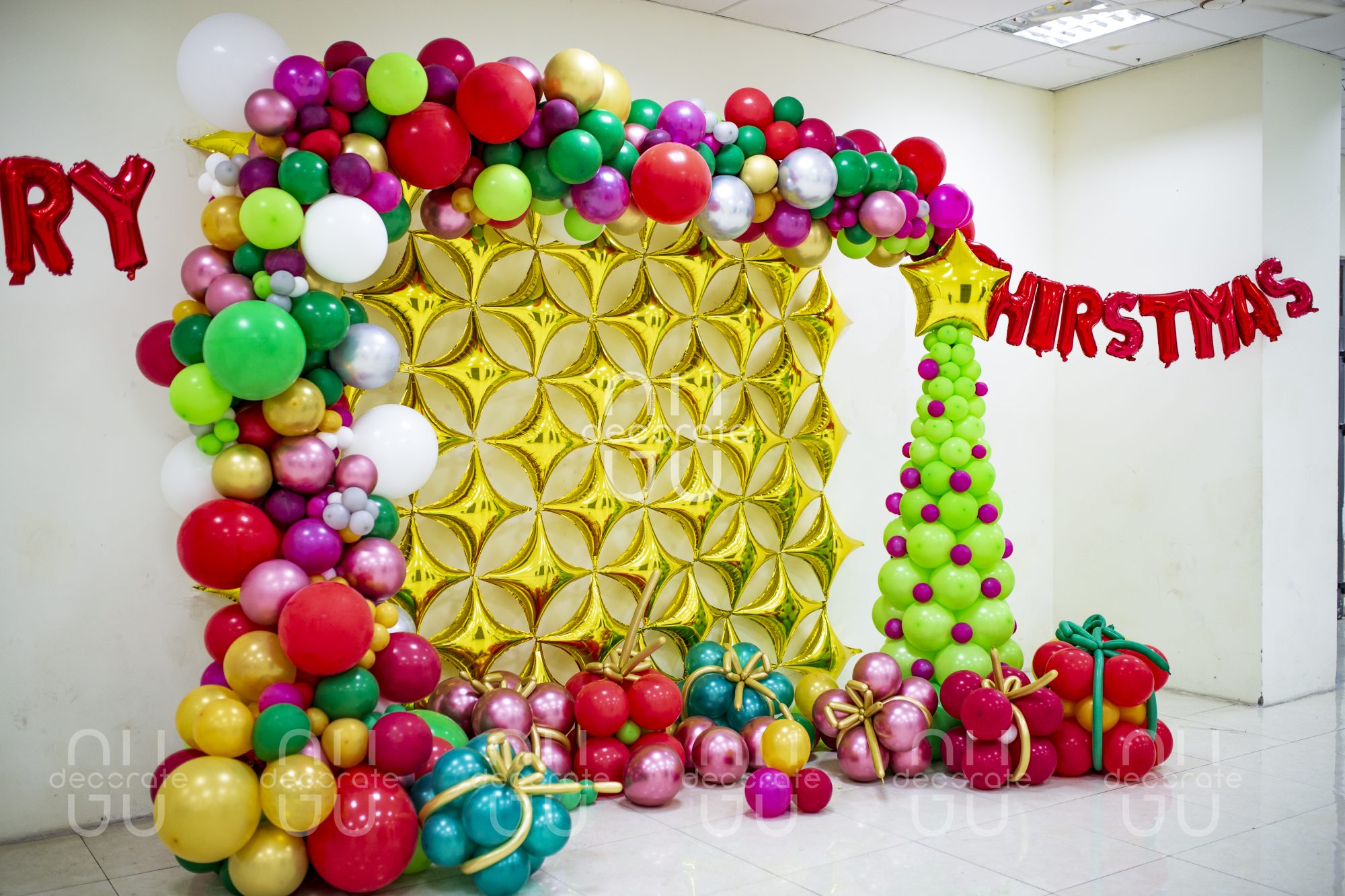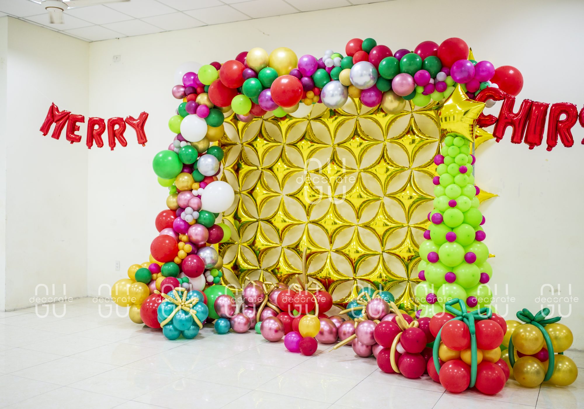 Ngày lễ Giáng Sinh nên được setup thế nào khi bạn không chuẩn bị kịp cây thông xanh, Ông già Noel được kéo bởi những chú tuần lộc?. Hãy để GuDacorate thay bạn xây dựng không gian độc đáo này bằng những vật liệu vô cùng đơn giản từ bóng chữ, bóng bay.