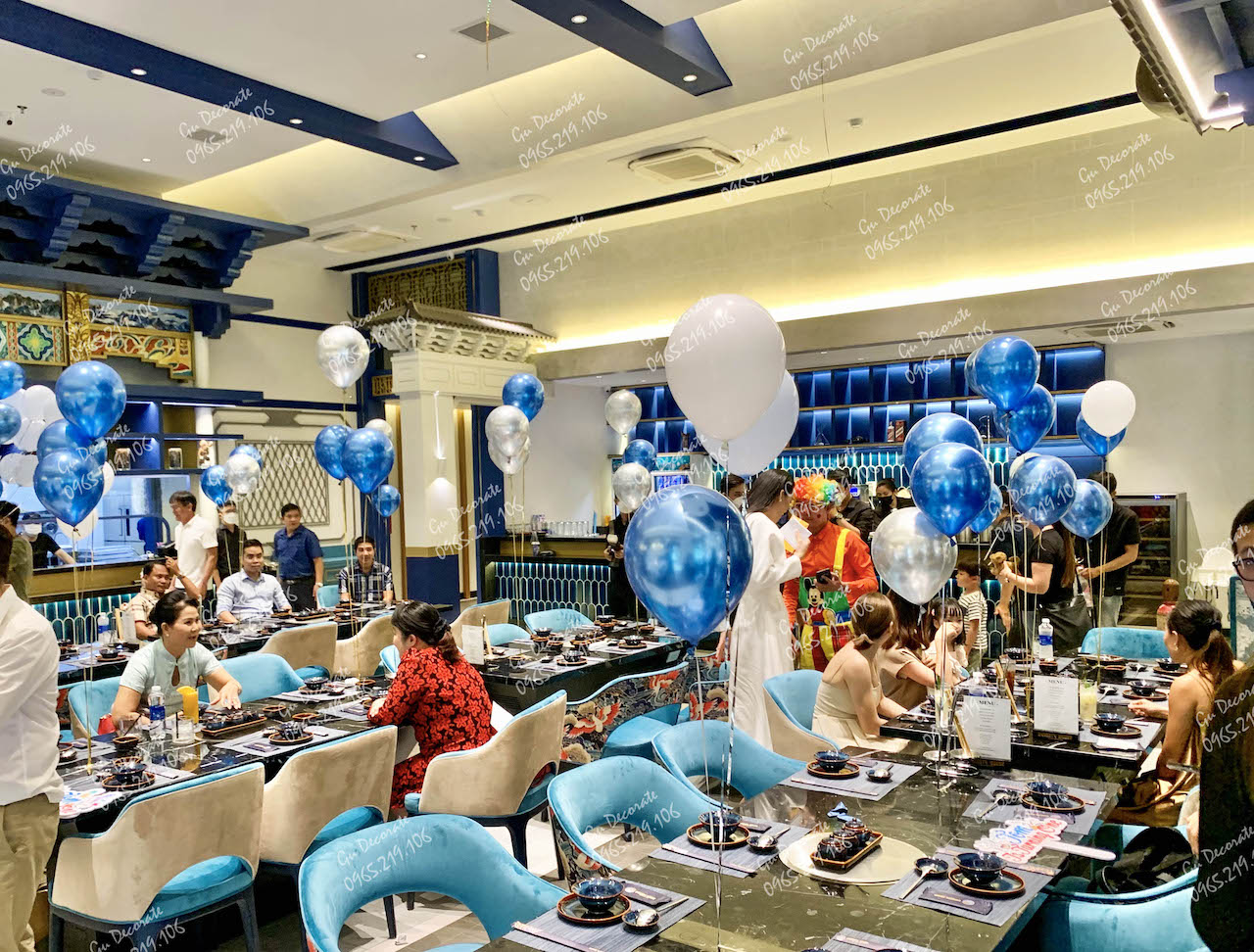 Những bàn tiệc nhỏ cũng được trang trí thêm bởi bóng bay cùng tông màu xanh đáng yêu. Chắc hẵn những vị khách mời cũng cảm nhận được niềm vui ,thư giãn và thoải mái trò chuyện tâm tình với nhau