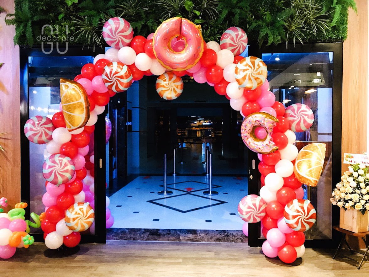 Cổng chào bong bóng bánh donut, kẹo alpenliebe,…